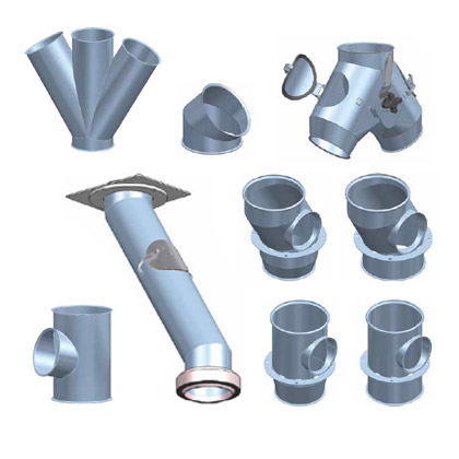 La tubazione di caduta utilizzata nel settore molitorio per il passaggio del prodotto (semola, farina, etc.) viene realizzata in acciaio inox aisi 304 BA sp.10-12-15/10 elettrosaldata con trattamento di lucidatura esterna, nei diametri 105-120-150-200-250-300 mm.